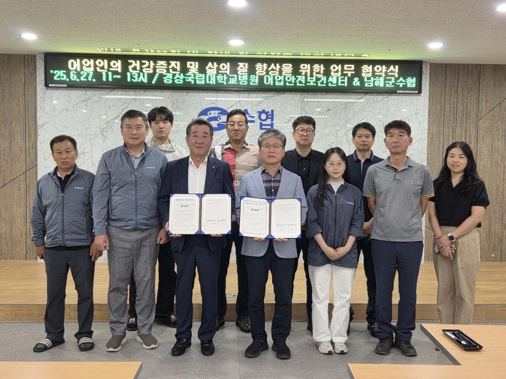 경상국립대학교병원 어업안전보건센터에서는 2025년 6월 27일 오전 11시에 남해군수협과 어업인의 건강증진 및 삶의 질 향상’을 위한 업무협약을 체결하였습니다.