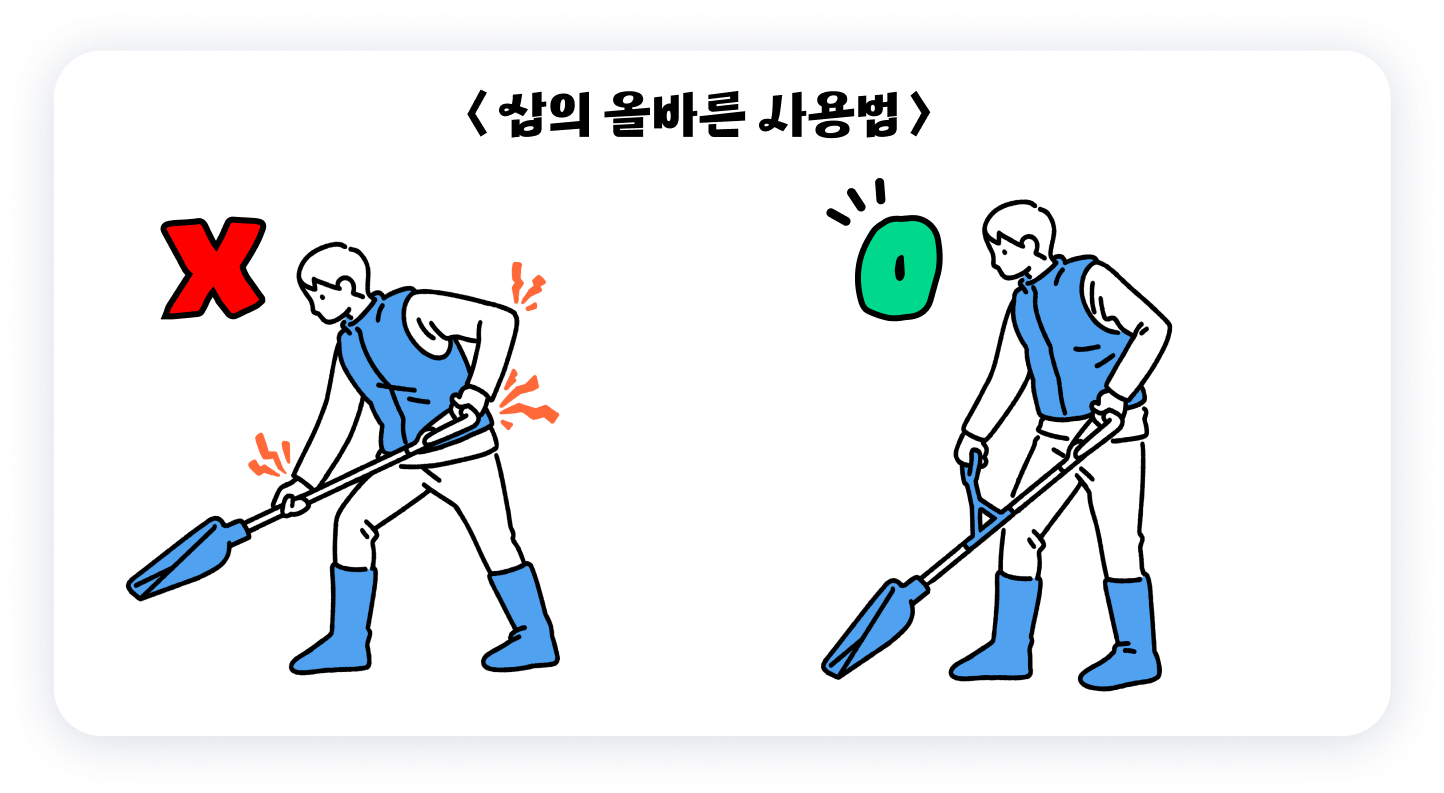 그래서 삽질은 요추손상위험이 큰 작업입니다.